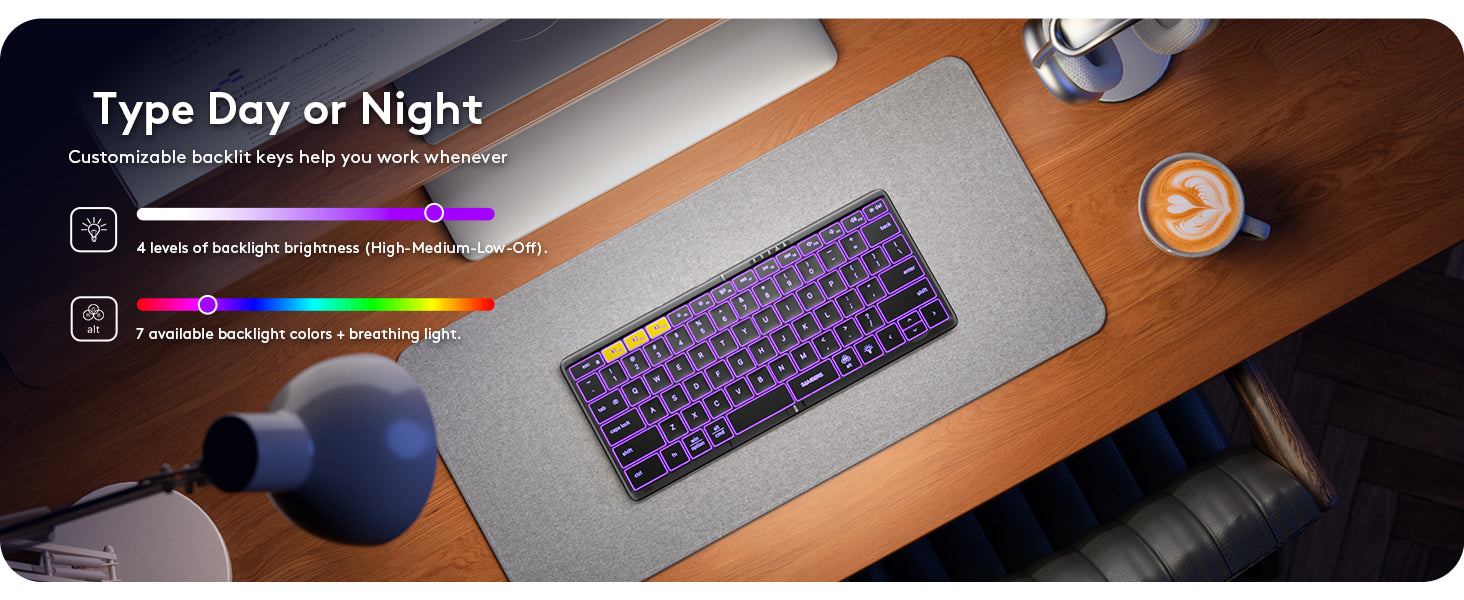 The backlit wireless keyboard has 7 switchable backlit colors, 7 colors breathing light, 4-level adjustable brightness.