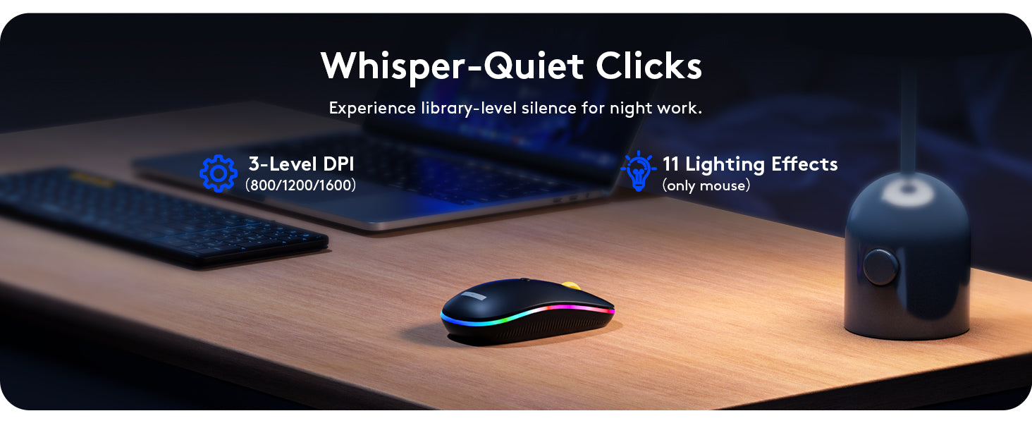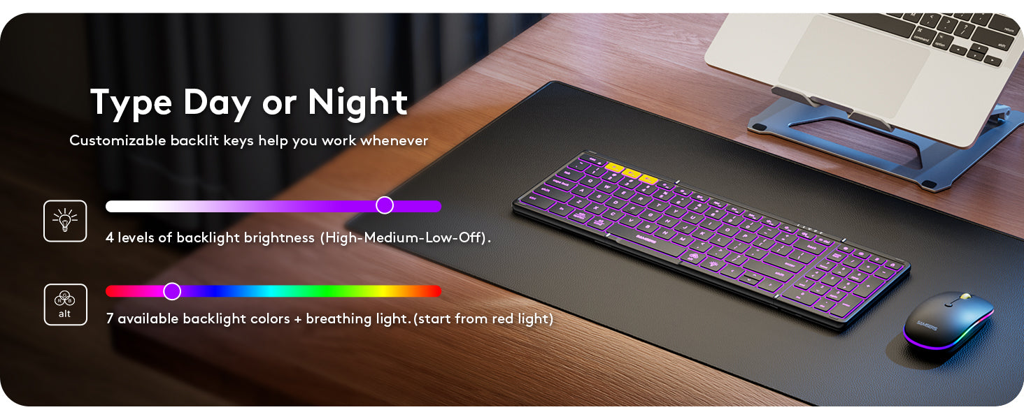 The backlit wireless keyboard has 7 switchable backlit colors, 7 colors breathing light, 4-level adjustable brightness.